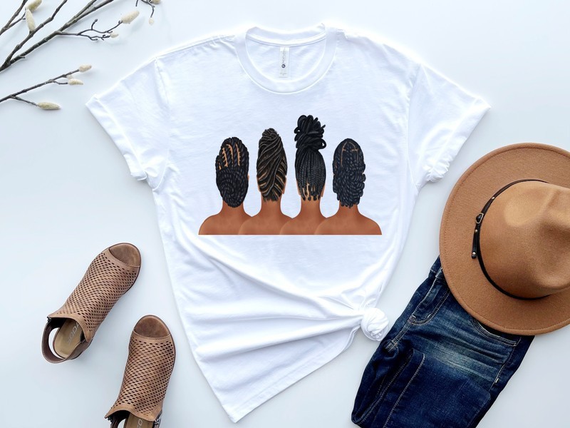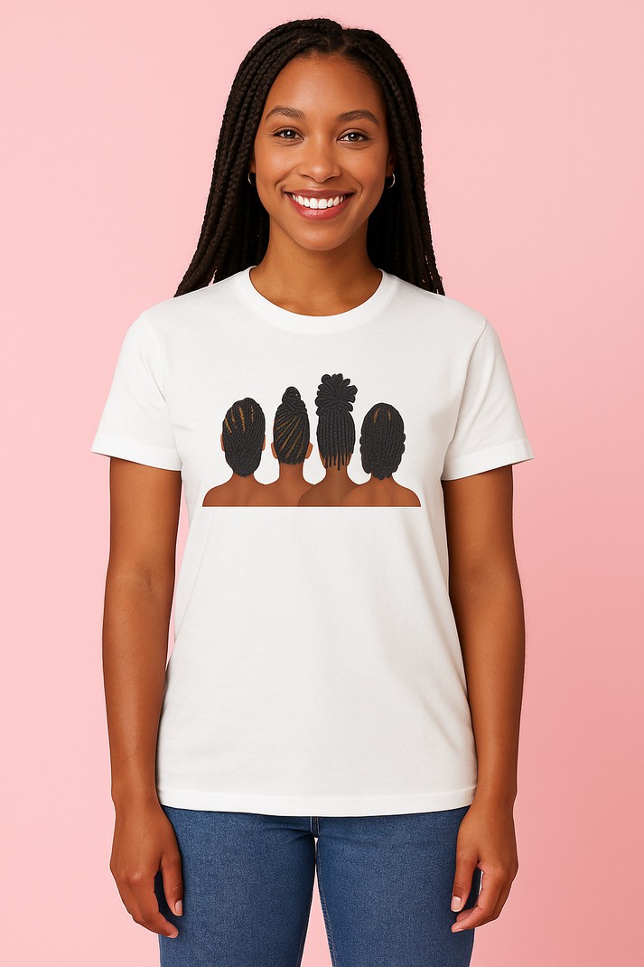 Celebrate culture, style, and confidence with this women's graphic tee. Featuring a powerful design of three Black women's profiles. The bold artwork honors beauty, diversity, and strength, making it a standout piece in any wardrobe. Made from soft, breathable cotton, it's designed for everyday comfort without sacrificing style. Dress it down with jeans for a casual day out, or pair it with a blazer for a modern, edgy look. Whether you're buying it for yourself or as a meaningful gift, this tee is perfect for anyone who loves fashion with purpose. ✔ Soft and lightweight fabric for all-day wear ✔ Flattering cut that fits true to size ✔ Durable print that won't fade after washing Add it to your cart today and wear your pride with style. Material: 100% ring-spun cotton Weight: 4.5 oz / y² (153 g / m²) Pre-shrunk for added durability Round collar Production: This product is made to order. The design is printed in one of our production centers (UK, EU, USA or Canada - depending on your delivery address).