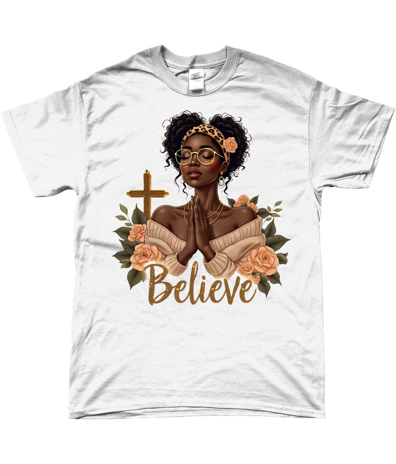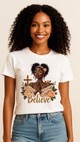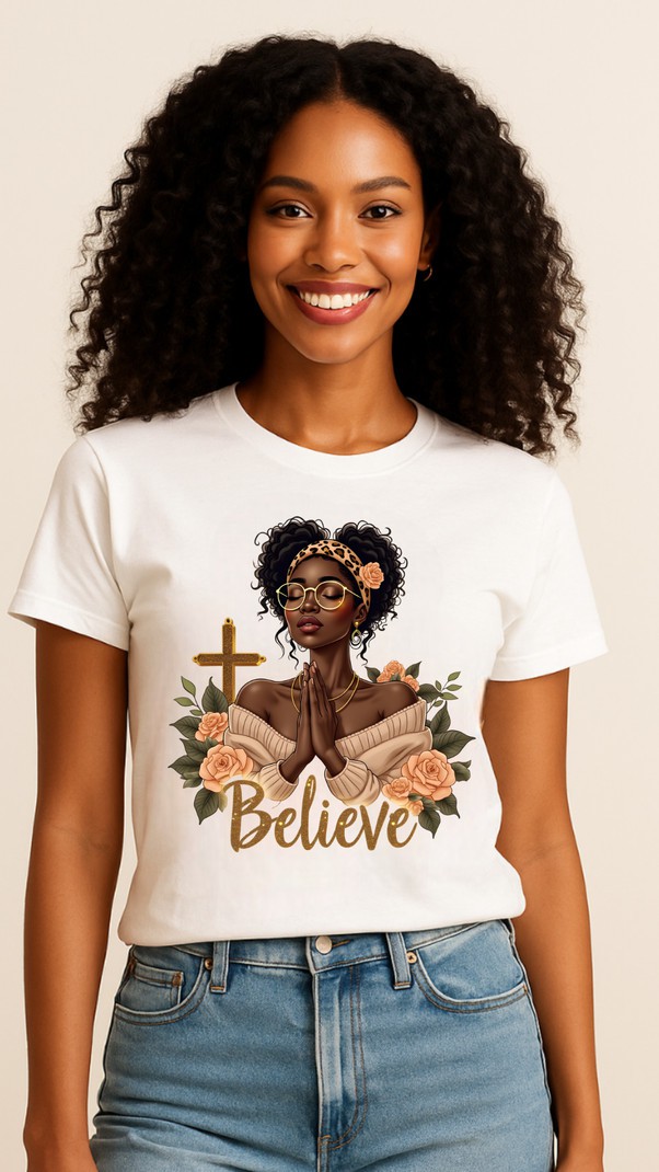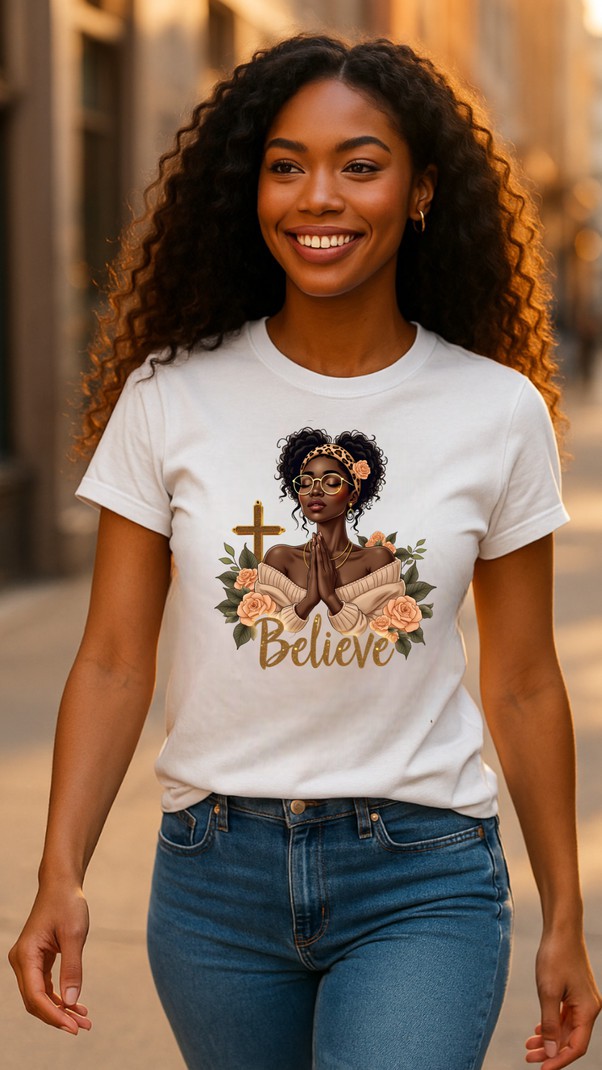 This classic white t-shirt showcases a powerful image of a Black woman in prayer, hands gently clasped and a serene smile on her face. Her natural curly afro radiates confidence and beauty, making this design both inspiring and uplifting. Crafted for comfort and everyday wear, this tee is perfect for those who want to express their faith, pride, and personal style all at once.