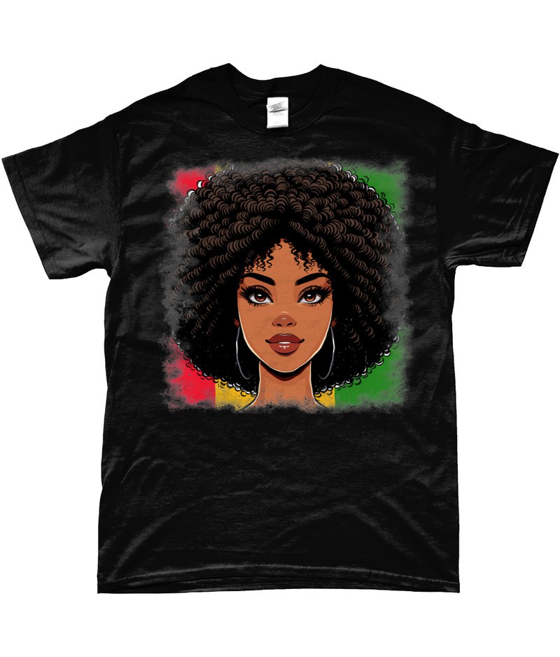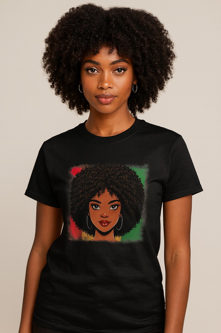 Afro Woman Black T-Shirt – Culture Meets Style Turn heads with our bold black t-shirt, featuring a beautifully designed Afro woman's face that celebrates culture, strength, and individuality. More than just a tee, it's a wearable piece of art that speaks to identity and pride. Crafted from soft, breathable cotton, this shirt delivers all-day comfort while holding its shape wash after wash. Its versatile design makes it perfect for casual outings, cultural events, or as a standout statement piece in your wardrobe. - Premium cotton fabric, soft and durable - Unique Afro woman design for cultural expression - Unisex fit, sizes S–5XL - Easy to style with jeans, skirts, or layered looks Celebrate who you are and let your style speak for itself. Material: 100% ring-spun cotton Weight: 4.5 oz / y² (153 g / m²) Made to order in one of our production centers (UK, EU or Canada).