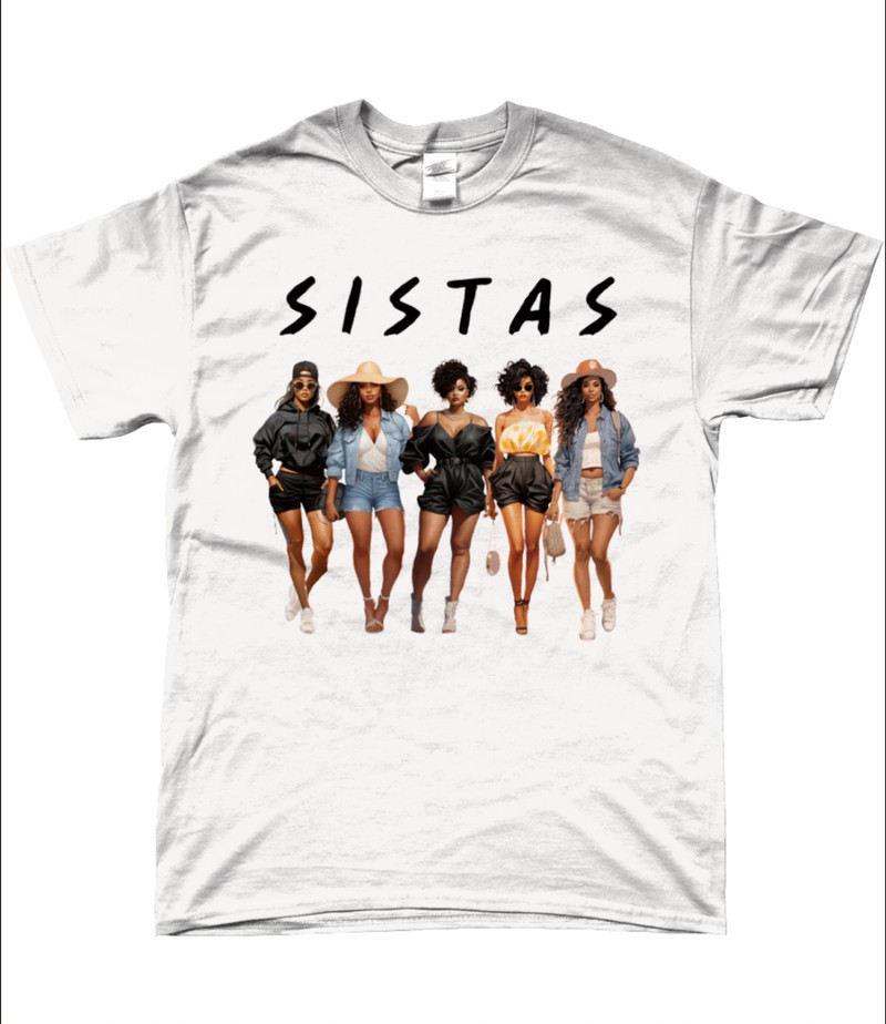 Celebrate sisterhood in style with this vibrant “SISTAS” t-shirt. Featuring a bold design of four fashionable women walking together, this tee showcases unity and confidence. Perfect for casual outings or making a statement, it's made from soft, durable fabric to keep you comfortable all day. Ideal for women who embrace friendship, strength, and empowerment. Get yours today and wear your pride! Material: 100% ring-spun cotton Weight: 4.5 oz / y² (153 g / m²) Pre-shrunk for added durability Round collar Unisex or woman cut (your choice) Care Instructions: Machine wash cold inside out. Gentle cycle with mild detergent and like colors. Do not use bleach or fabric softener. Do not tumble dry. Hang to dry to ensure maximum shelf life. Iron inside out if necessary. Do not iron the print. Do not dry clean. Production: This product is made to order. The design is printed in one of our production centers (UK, EU, USA or Canada - depending on your delivery address).