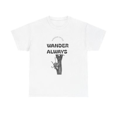 This soft, classic-fit tee carries a quiet wanderer’s spirit. On a clean white canvas, a finely detailed ink-style illustration of a tree trunk and climbing vine sits beneath the bold, rounded words “WANDER ALWAYS.” The design reads like a worn travel sketch found in the back pocket of a trail journal — calm, curious, and quietly determined. Wear it on slow mornings before a hike, on cross-country drives, or layered under a jacket for evenings around the fire. The relaxed silhouette lets movement feel easy; the durable, smooth cotton keeps the print sharp and the shirt feeling familiar day after day. It’s a simple, tactile reminder to keep exploring and to carry curiosity with you wherever you go.