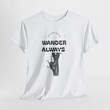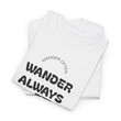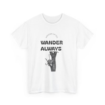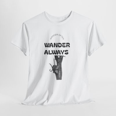 This soft, classic-fit tee carries a quiet wanderer’s spirit. On a clean white canvas, a finely detailed ink-style illustration of a tree trunk and climbing vine sits beneath the bold, rounded words “WANDER ALWAYS.” The design reads like a worn travel sketch found in the back pocket of a trail journal — calm, curious, and quietly determined. Wear it on slow mornings before a hike, on cross-country drives, or layered under a jacket for evenings around the fire. The relaxed silhouette lets movement feel easy; the durable, smooth cotton keeps the print sharp and the shirt feeling familiar day after day. It’s a simple, tactile reminder to keep exploring and to carry curiosity with you wherever you go. Product features - Shoulder tape for stabilized seams and reduced stretching - Tubular knit (no side seams) for a clean look and less fabric waste - Ribbed knit collar that retains shape and provides elastic comfort - Medium-weight 100% cotton fabric (180 g/m²) with smooth surface ideal for printing - Tear-away label, ethical cotton sourcing, and Oeko-Tex certification for comfort and safety Care instructions - Non-chlorine: bleach as needed - Do not iron - Do not dryclean - Machine wash: cold (max 30C or 90F) - Tumble dry: low heat