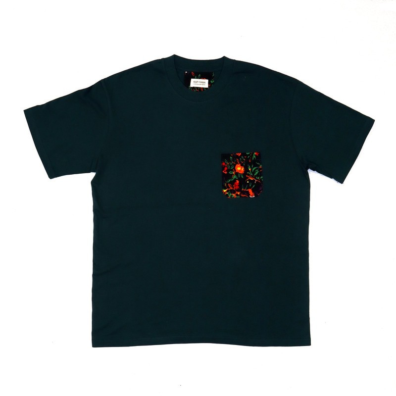 Tee-shirt vert forêt intense, avec une poche en wax Ekang aux motifs tribaux. Réalisé à la main, ce modèle en coton résistant est idéal pour un style à la fois naturel et audacieux.