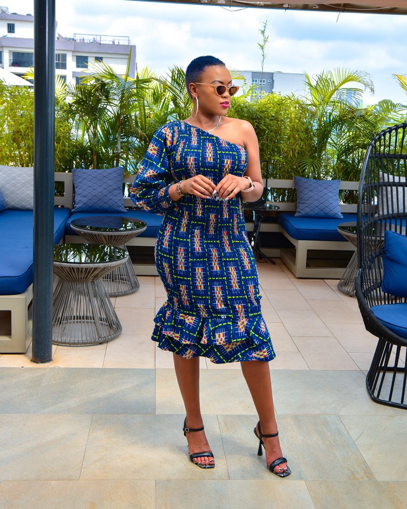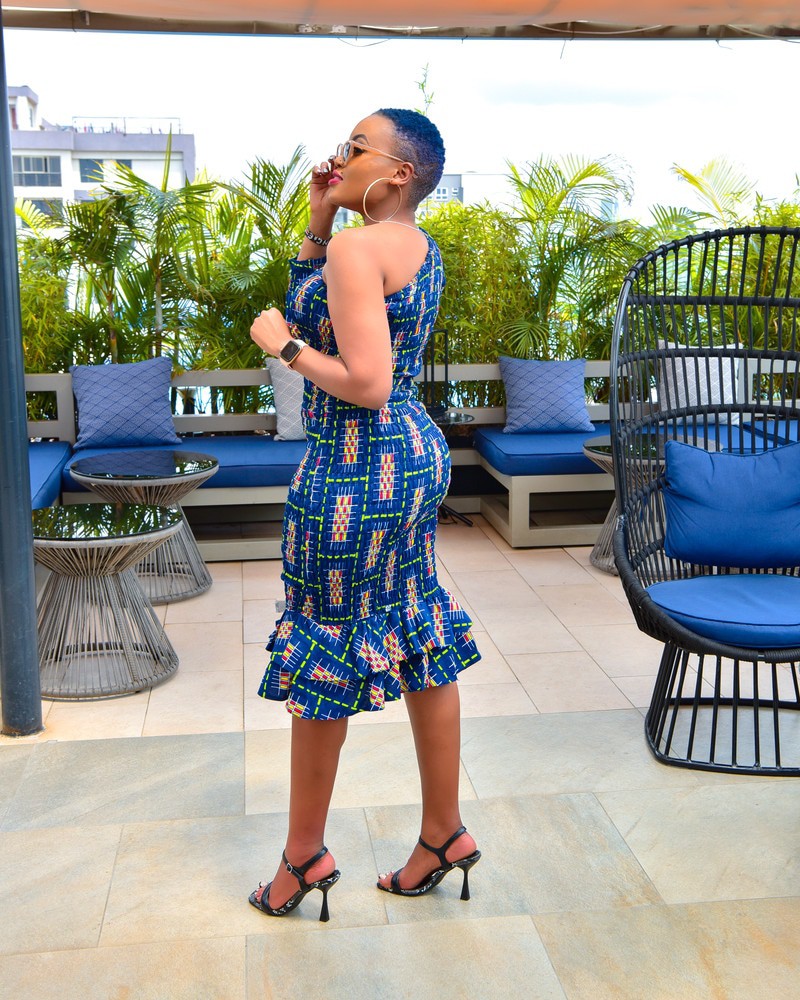 The Adhiambo African print body con dress is sophisticated and elegant and features a one arm off-the-shoulder design and a chic peplum at the bottom, making it perfect for any special occasion. The body con design ensures the dress hugs you in all the right places. Pair it your favorite pair of open high heels and you are good to go.✨ The Adhiambo dress is made in Kenya 🇰🇪 using locally sourced Ankara Fabrics.
