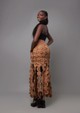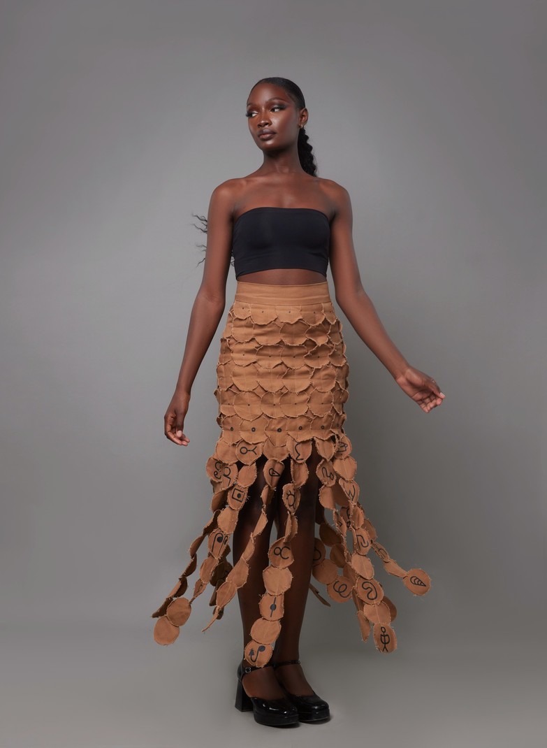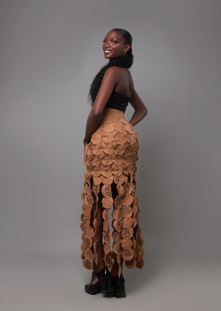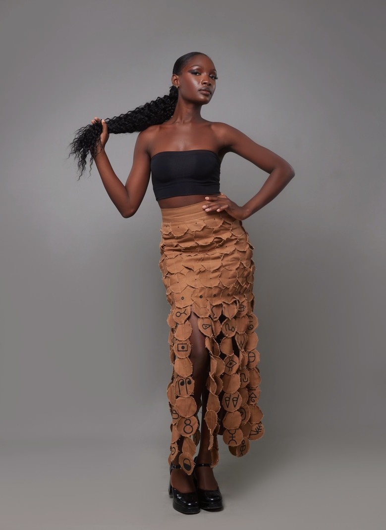 The Agile skirt is a textile artwork inspired by nature and forgotten languages. Entirely made from an assemblage of layered, cut-out shapes, it evokes lush, living vegetation in constant motion. Each element is carefully embroidered and punctuated with hand-painted letters from the Bété alphabet, giving the piece a vibrant and symbolic dimension. Halfway between sculpture and garment, this skirt celebrates grounding and connection to the earth, while letting the lower panels flow and move freely with the body. It embodies a powerful, rooted femininity, in continuous dialogue with memory and gesture.
