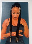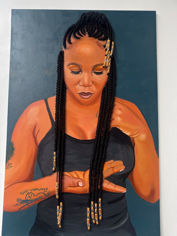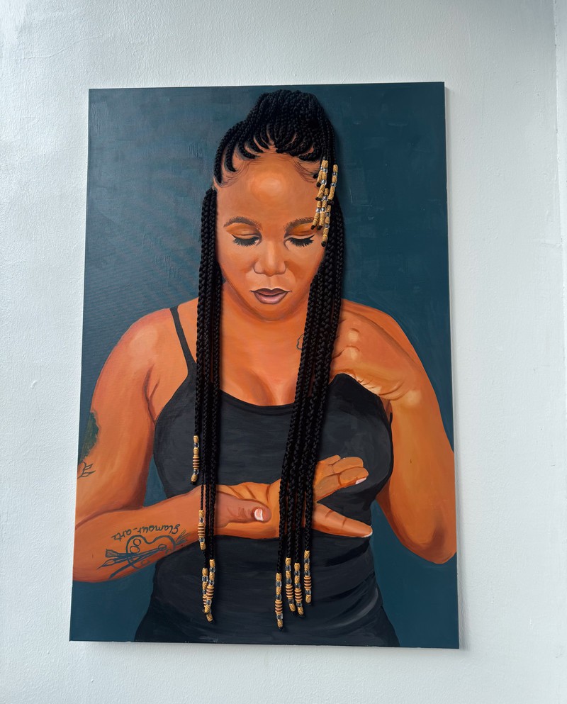 THE BEAUTY WE WEAR celebrates the pride, creativity, and heritage woven into African hairstyles. Every braid, bead, and strand carries a story - of identity, ancestry, and self-expression. This piece reminds us that our hair is more than style; it is culture, history, and art. Through this work, I honor the beauty that comes naturally to us, the kind we wear proudly without apology. It's a visual love letter to African women who embrace their roots and crown themselves with confidence. Medium: mixed media Year: 2025 Dimension: 3 x 4 feet Original piece hand painted by the artist.