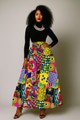 Jupe longue coupe ovale en patchwork de coton wax. Motifs végétaux et floraux, touches graphiques. Ceinture large en wax imprimé . Fermeture par zip à l’arrière