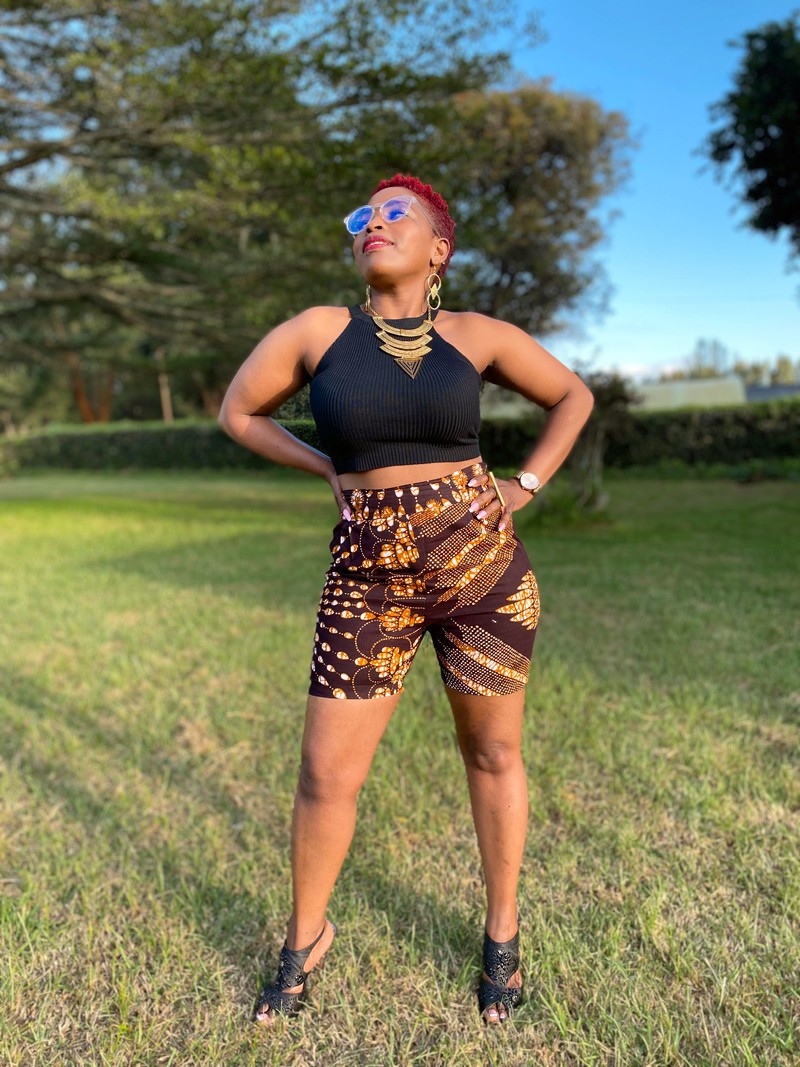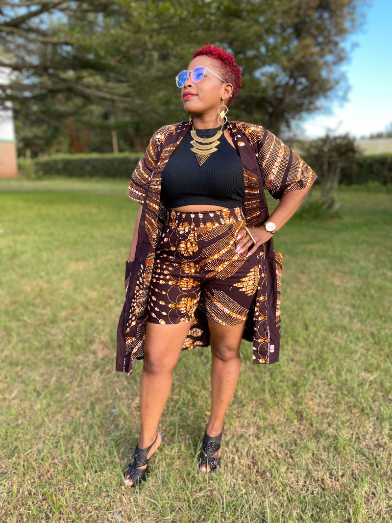 The Diamond Kimono and shorts set is stylish and versatile and can be styled down with a pair of sneakers for a relaxed casual look or with a pair of high heels for a sophisticated look. The set features a short that has a high waist design and a short kimono with pockets. The short can also be styled separately with a black or brown crop top while the kimono can be styled with a dress or a pair of jeans.