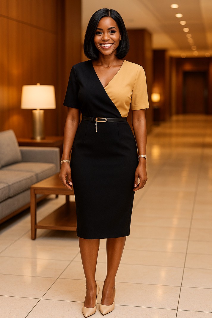 The Essential Midi Pencil Wrap Dress in Black and Gold offers a timeless silhouette designed to flatter and support your confidence. Its wrap style gently shapes your figure, while the midi length provides elegant coverage for any occasion. The sophisticated black and gold tones add a refined touch, making it a versatile choice for work or evening events. Comfortable and stylish, this dress is crafted to help you feel poised and empowered throughout your day.