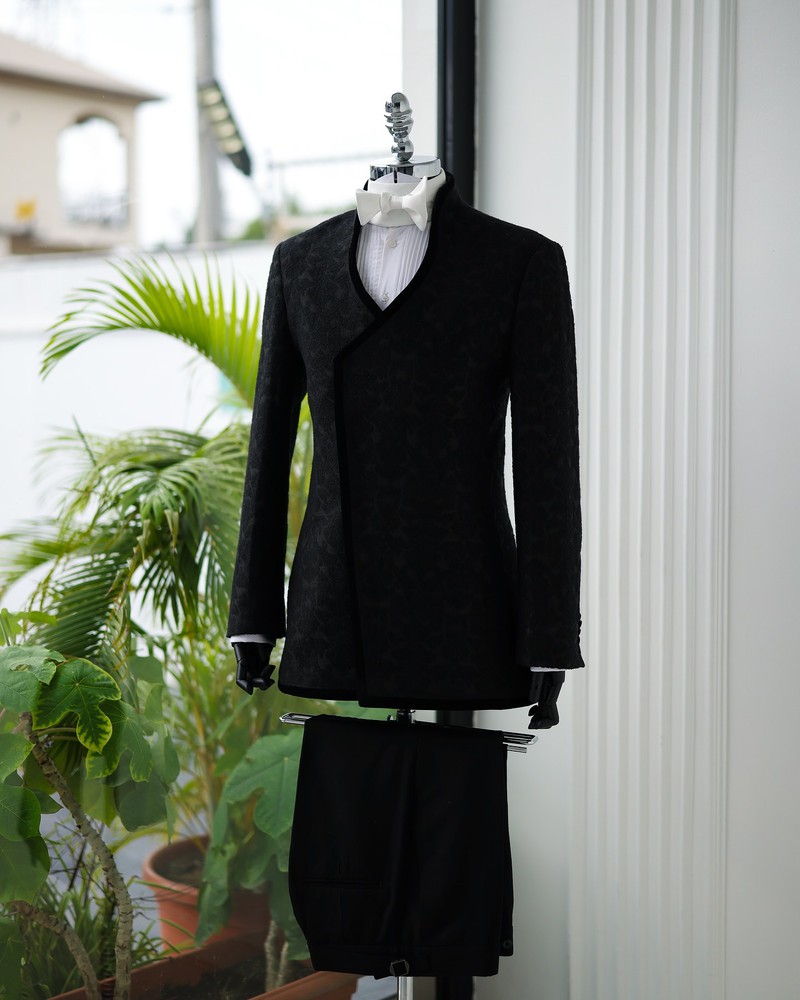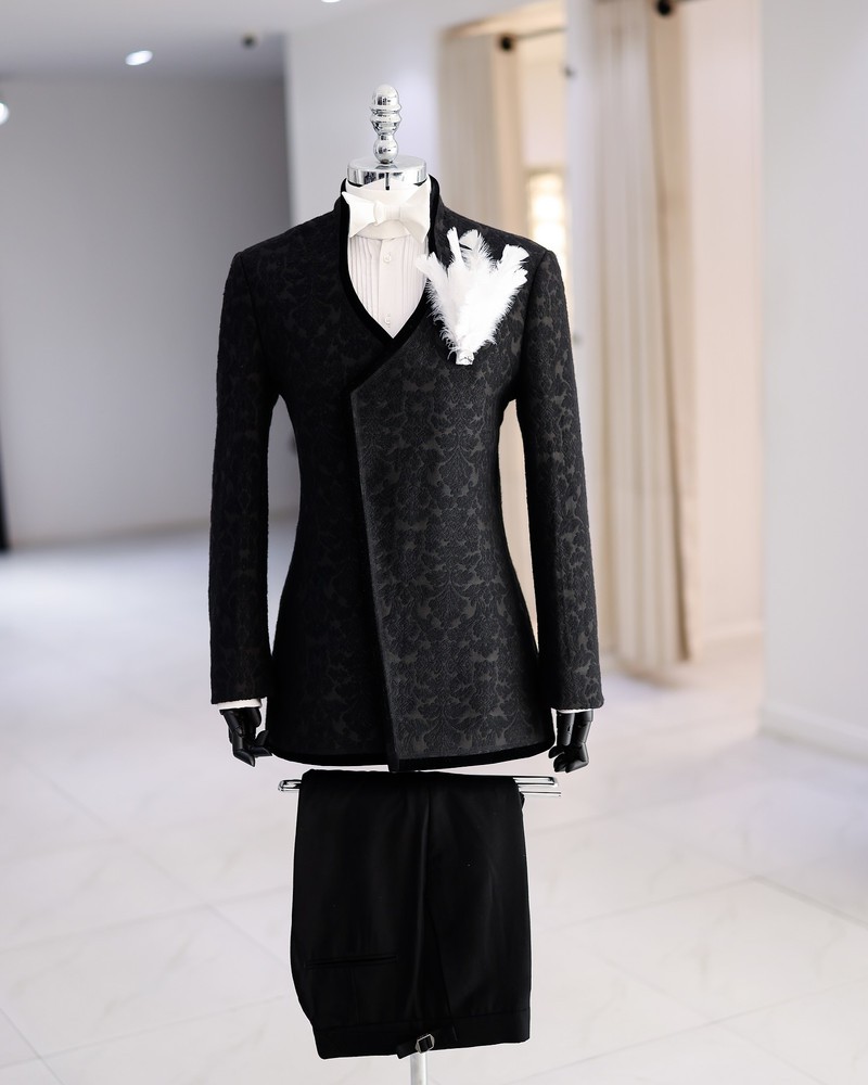 A Charcoal Black floral jacquard, round cut neck line with black velvet taping tuxedo suit, Renaissance layered bow tie & pant trousers
