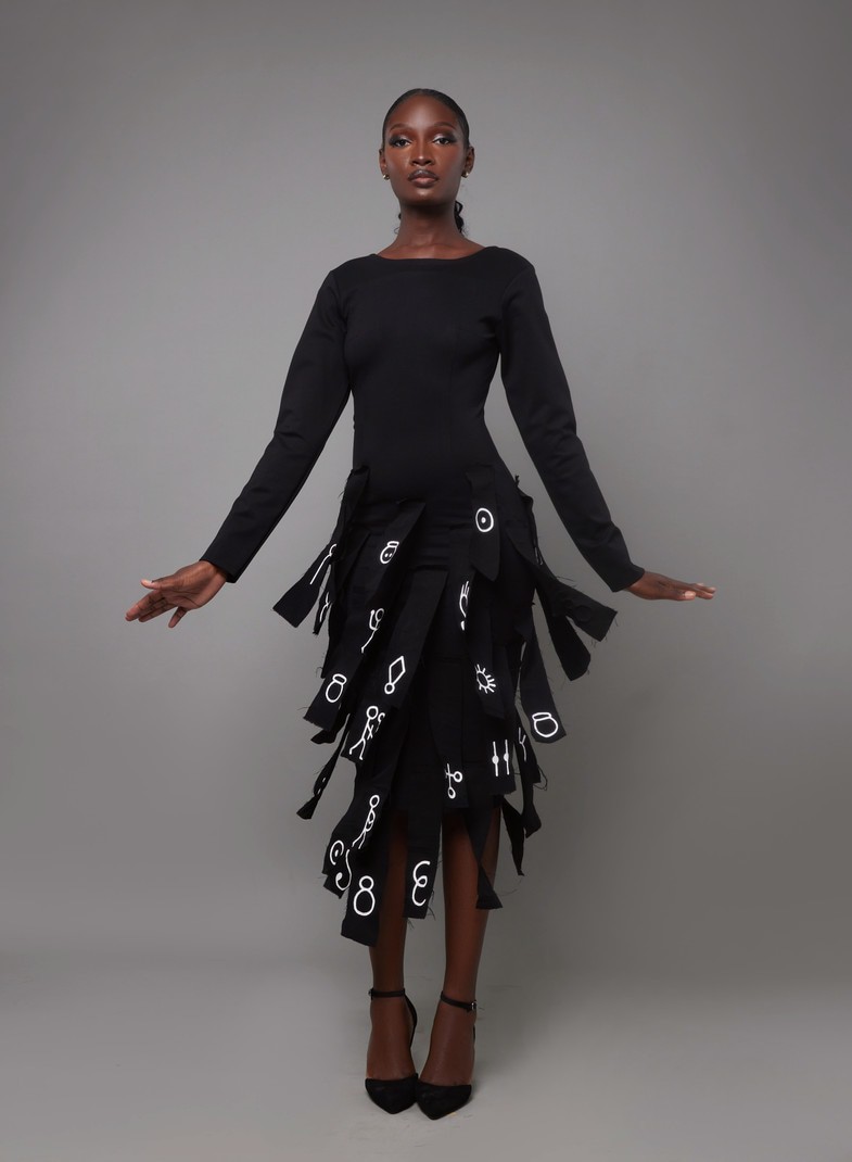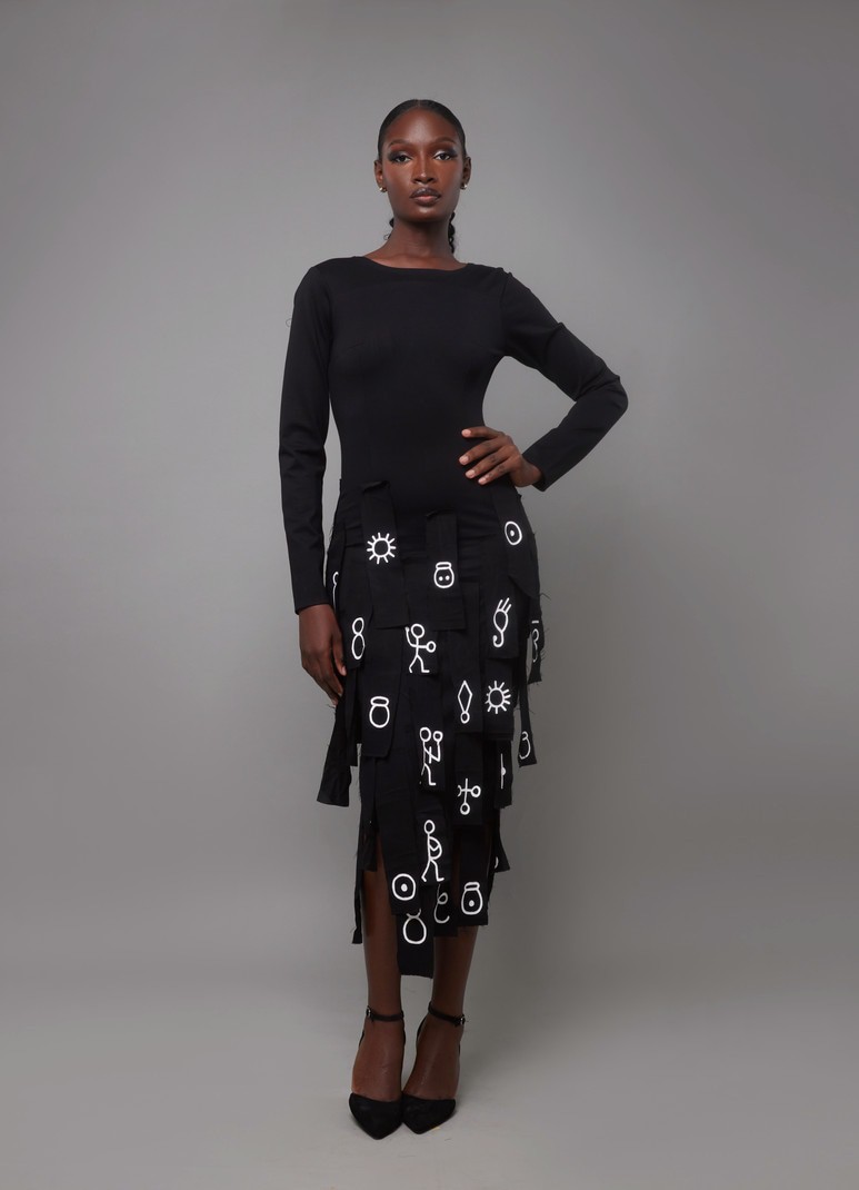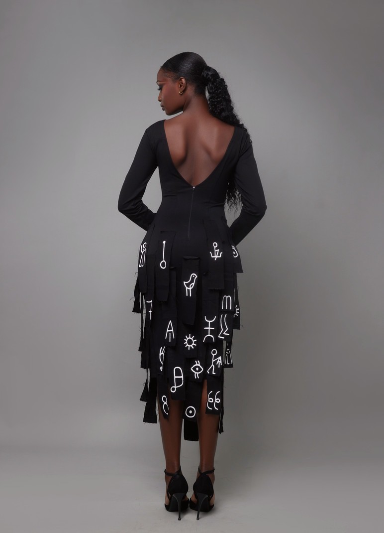 Designed as a sculptural and poetic silhouette, the L'Oiseau Rare dress blends structure and movement with elegance. Its fitted bodice gently shapes the figure, while the layered skirt panels create a rhythmic, almost architectural volume. Each panel is hand-painted with letters from the Bété alphabet, turning the dress into a canvas of memory and identity. At the back, a deep V-cut reveals the spine with subtle sensuality, adding contrast to the strong lines of the silhouette. More than just a dress, L'Oiseau Rare is a celebration of the body as a space of expression—a textile manifesto where every detail speaks of flight, freedom, and the rarity of those who dare.
