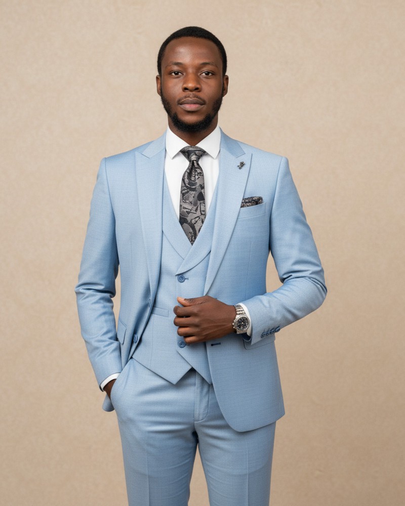 Inject a fresh, vibrant color into your formal wardrobe with The Santorini Suit. Tailored in a striking Light Blue (Sky Blue), this 3-piece ensemble is designed for the man who wants to look sophisticated while making a memorable, cheerful impression. Perfect for summer weddings, beach ceremonies, prom, or any event where you want to stand out from the sea of navy and grey.Key Features:FeatureDetailStyleModern 3-Piece Suit with a Notch Lapel and VestFitTailored Slim FitColorLight Blue / Sky Blue (A refreshing, pastel tone)JacketSingle-breasted, two-button closure with classic notch lapels, structured shoulders, and a single vent (or double vent, depending on the physical garment).VestSingle-breasted waistcoat with a sharp V-neck cut and three-button closure, perfectly matching the main suit fabric.TrousersFlat-front, tailored trousers, color-matched to the jacket and vest.AccessoriesStyled here with a white dress shirt and a contemporary black/grey patterned tie and pocket square.MaterialHigh-Quality Textured Suit Fabric (e.g., a lightweight poly-rayon or wool blend) offering a sharp drape and wrinkle resistance.OccasionSpring/Summer Wedding, Groom/Groomsmen, Prom, Cocktail Events, Fashion-Forward Business.Why You'll Love It:Distinctive Color: The light blue hue is versatile and visually appealing, offering a refreshing alternative to traditional suit colors.Flattering Silhouette: The slim-fit tailoring on all three pieces—jacket, vest, and trousers—creates a modern, flattering, and confident look.Ultimate Versatility: Wear the full 3-piece for maximum formality, or pair the jacket/trousers with different shirts and accessories for a smart casual appearance.Attention to Detail: Complemented by a subtle lapel pin and a patterned pocket square, showcasing a polished, editorial finish.📐 Custom-Made ServiceThis premium suit is available as a custom-made piece to ensure the perfect fit for your unique measurements. Please provide the following details to begin the tailoring process.Where to Measure:MeasurementInstructionsChestMeasure around the fullest part of your chest, under the arms, keeping the tape horizontal.Stomach/Waist (Jacket)Measure around the fullest part of your abdomen (usually just above the naval).Shoulder WidthMeasure straight across the back from the tip of one shoulder bone to the tip of the other.Sleeve LengthMeasure from the shoulder seam/tip down to where you want the cuff to rest (usually at the wrist bone).Trouser WaistMeasure around your natural waistline where you normally wear your trousers.Trouser LengthMeasure from the top of the waistband down to the desired hem length (usually touching the top of the shoe).Hips/SeatMeasure around the fullest part of your hips and rear.HeightYour total height from the top of your head to the floor.Send your measurements after purchase to begin the custom tailoring process.