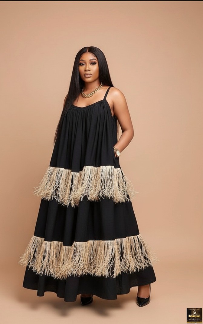 Embrace sun-drenched glamour with the Sahara Tier Maxi Dress, a voluminous, statement gown crafted for resort living and grand entrances. The dress features a simple, elegant scoop-neck bodice supported by thin straps, flowing into a dramatically full skirt of tiered black fabric. Each horizontal tier is lavishly detailed with thick, natural, straw-colored raffia fringe, creating dynamic texture and a bohemian-meets-luxury aesthetic. This stunning piece is an absolute showstopper for destination weddings, luxurious beach resorts, or high-end garden parties.