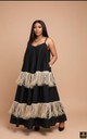 Embrace sun-drenched glamor with the Sahara Tier Maxi Dress, a voluminous, statement gown crafted for resort living and grand entrances. The dress features a simple, elegant scoop-neck bodice supported by thin straps, flowing into a dramatically full skirt of tiered black fabric. Each horizontal tier is lavishly detailed with thick, natural, straw-colored raffia fringe, creating dynamic texture and a bohemian-meets-luxury aesthetic. This stunning piece is an absolute showstopper for destination weddings, luxurious beach resorts, or high-end garden parties. Material: crepe,fringe Color: Black