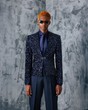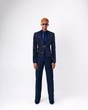 A Navy Blue Sequin Collarless suit with beaded Swarovski detailing