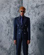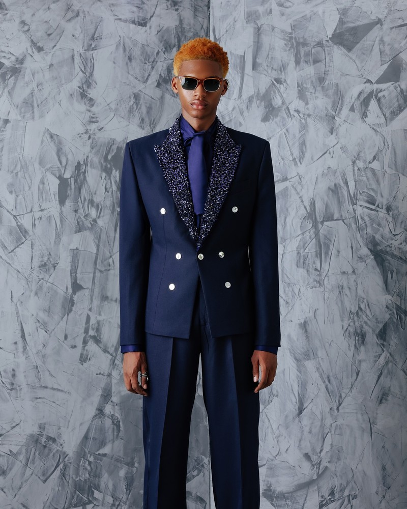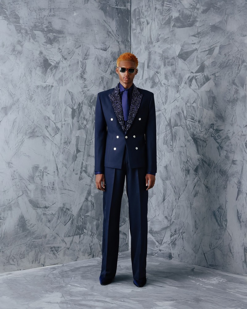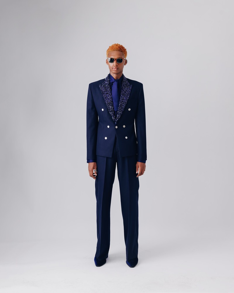 What you get: A Navy blue Sequin peak lapel collared suit with beaded Swarovski detailing Flare-cut pants Additional Items on Request
