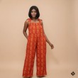 This vibrant wide-leg jumpsuit is expertly crafted from premium hand-dyed batik cotton, offering a breathable and lightweight feel that ensures all-day comfort. The garment features a warm terracotta-orange base adorned with rhythmic, mustard-yellow geometric patterns, creating a bold and energetic visual appeal that celebrates traditional textile artistry. Designed with a flattering square neckline and adjustable tie-shoulder straps, it provides a relaxed yet secure fit that flows into an effortless, floor-length silhouette. This versatile piece is an ideal choice for summer garden parties, upscale beach vacations, or creative outdoor festivals where you want to radiate a sense of modern, artisanal elegance.