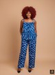 Embrace vibrant style with this eye-catching two-piece set. The top is a relaxed, sleeveless camisole in a stunning blue and white Adire print, featuring playful knotted shoulder straps. It pairs perfectly with the comfortable, wide-leg trousers in a rich indigo blue with a continuous white circular motif. Effortlessly chic and breathable, this set is your go-to for vacation wear, sunny weekend events, or adding a burst of color to your everyday wardrobe.