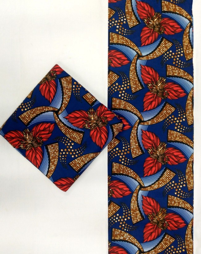 Turn heads with this vibrant navy-blue Ankara featuring striking red floral petals, curved geometric accents, and dotted gold detailing. The energetic, flowing pattern makes it perfect for standout outfits, accessories, home décor, or creative DIY pieces.