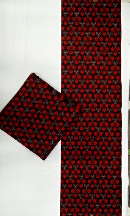 This African print fabric features a rich red and black palette with small, repeating floral-inspired motifs arranged in a tight geometric pattern, creating a bold yet refined look perfect for elegant outfits or statement accessories. 📦 Bulk orders available while stocks last!