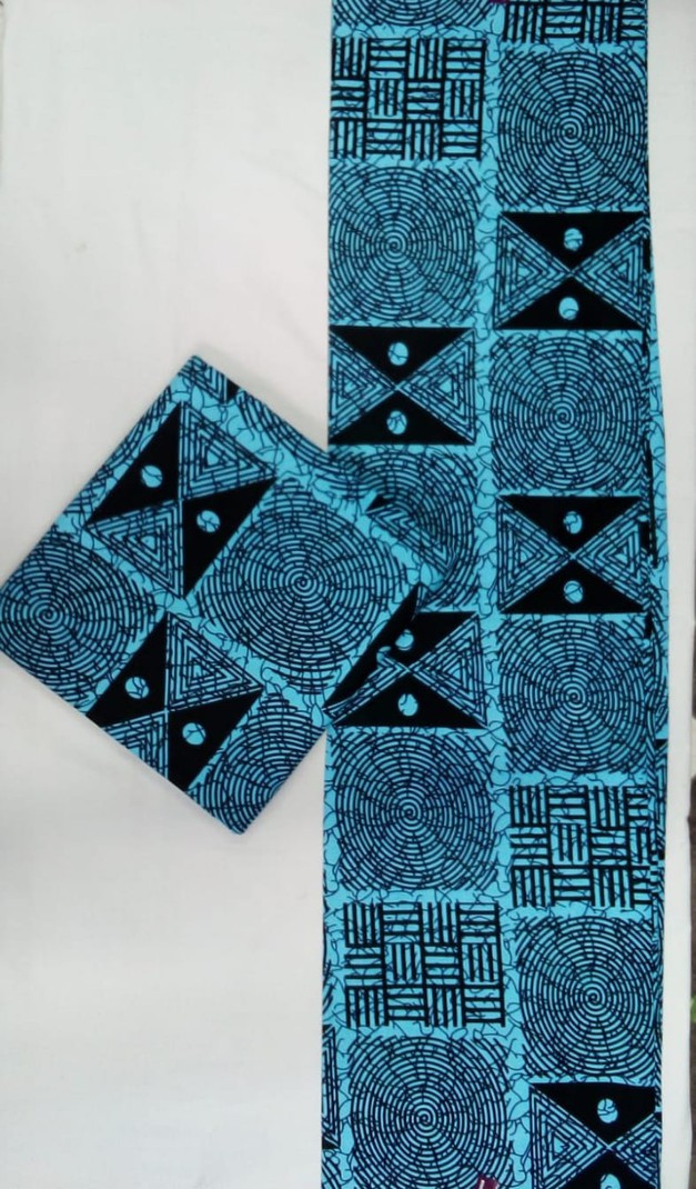 This fabric features a striking aqua-blue and black palette arranged in bold, geometric blocks. Each section highlights a different motif—from concentric circular patterns that create a sense of movement to angular triangular designs that add sharp contrast and symmetry. The layout forms a rhythmic, modern look while still retaining a distinctly African aesthetic, making it perfect for statement garments, accessories, or décor that calls for vibrant structure and artistic flair. 📦 Bulk orders available while stocks last!