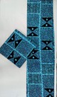 This fabric features a striking aqua-blue and black palette arranged in bold, geometric blocks. Each section highlights a different motif—from concentric circular patterns that create a sense of movement to angular triangular designs that add sharp contrast and symmetry. The layout forms a rhythmic, modern look while still retaining a distinctly African aesthetic, making it perfect for statement garments, accessories, or décor that calls for vibrant structure and artistic flair.