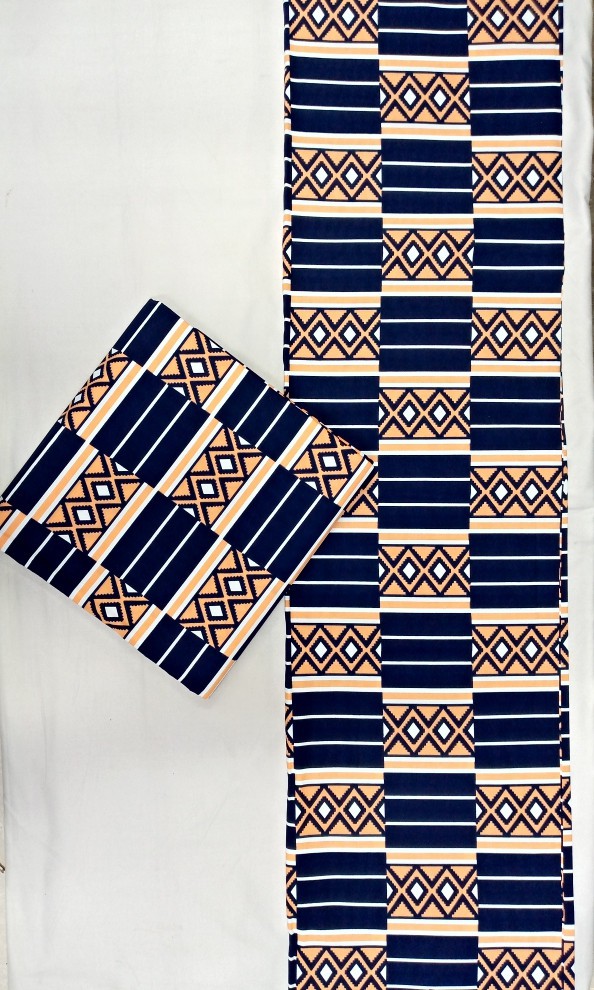 This elegant cotton fabric features a bold navy-and-tan geometric stripe pattern, blending clean linear accents with intricate diamond motifs for a modern yet culturally inspired look. Its smooth texture and vibrant, non-fading print make it perfect for crafting standout shirts, dresses, skirts, décor pieces, or coordinated fashion sets. A stylish choice for anyone seeking a versatile, premium fabric that delivers both sophistication and personality.