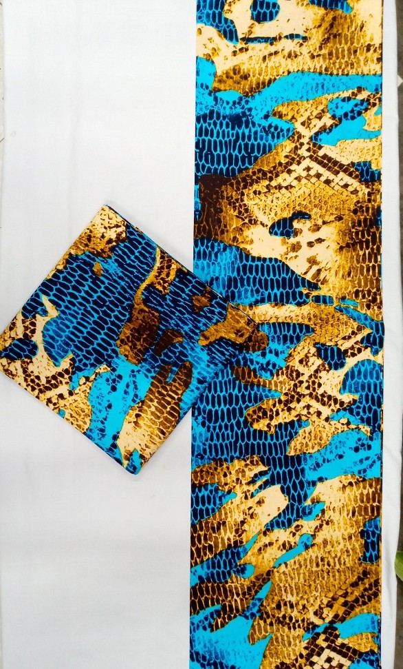 This premium cotton Ankara features a bold snakeskin-inspired pattern in electric blue and rich golden-brown tones, creating a striking, high-contrast look perfect for standout fashion pieces. The detailed scale-like design adds depth and texture while maintaining the soft, breathable comfort of 100% cotton. Ideal for dresses, shirts, skirts, and custom creations, this vibrant print brings a modern edge to traditional African fabric artistry.