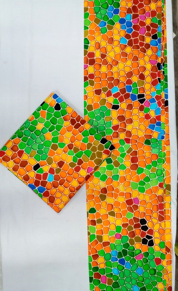 Bright and playful, this mosaic-print cotton fabric bursts with vibrant shades of orange, green, blue, pink, and yellow arranged in a stained-glass pebble pattern. The lively color mix gives it a cheerful, modern feel—perfect for statement outfits, accessories, or décor pieces that stand out with bold energy and artistic flair. 📦 Bulk orders available while stocks last!