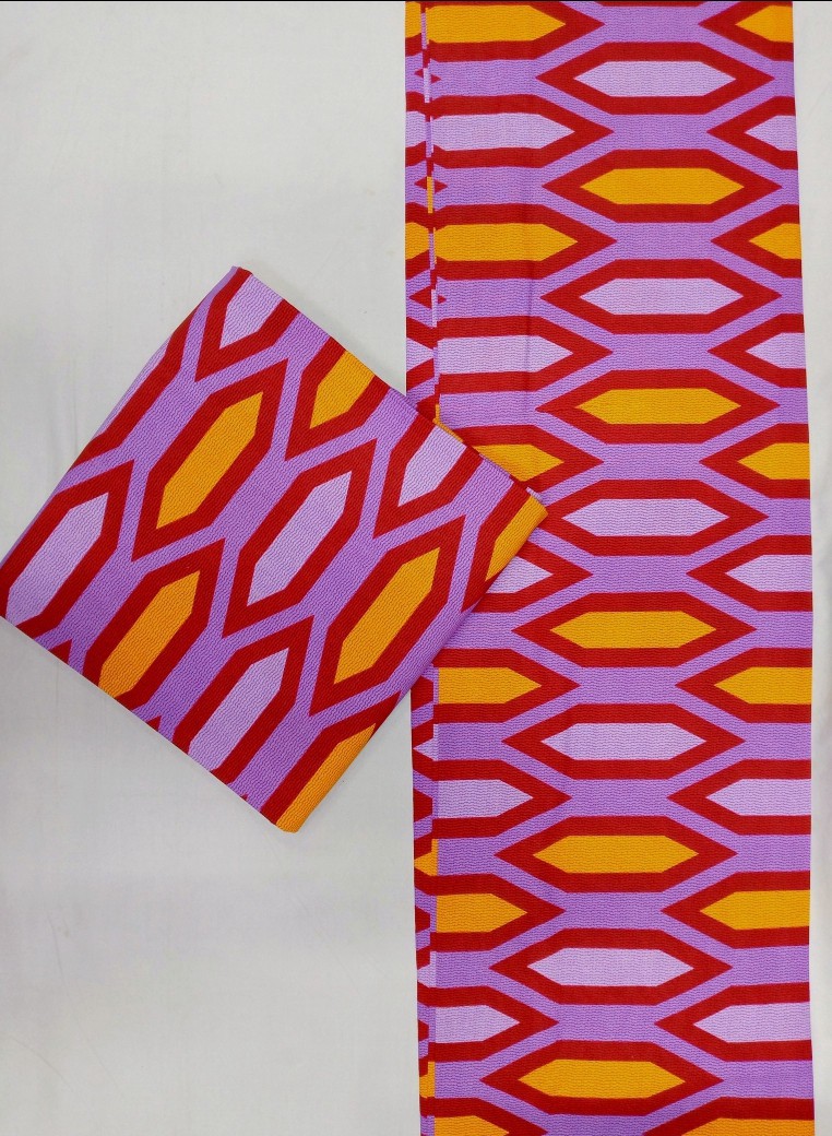 This vibrant fabric features a bold geometric print in striking red, orange, and lavender tones, creating a lively and modern statement perfect for standout fashion pieces. The repeating elongated diamond motifs add structure and movement, while the bright color palette enhances its contemporary appeal. Soft, versatile, and eye-catching, it's ideal for dresses, shirts, headwraps, and custom creations that demand both style and personality. 📦 Bulk orders available while stocks last!