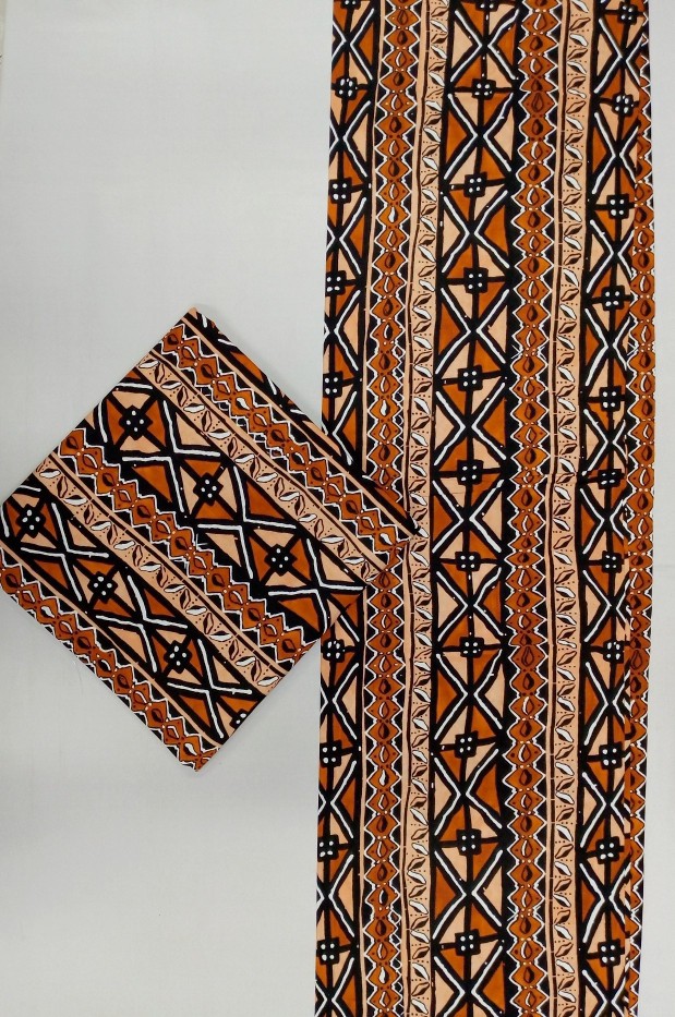 Brings a warm, earthy rhythm with its caramel-brown base and bold black geometric detailing, accented by soft cream highlights. The vertical tribal-inspired stripes create a striking, elongated silhouette—perfect for clean-cut kaftans, tailored shirts, dresses, or coordinated sets that radiate cultural confidence and contemporary flair. 📦 Bulk orders available while stocks last!