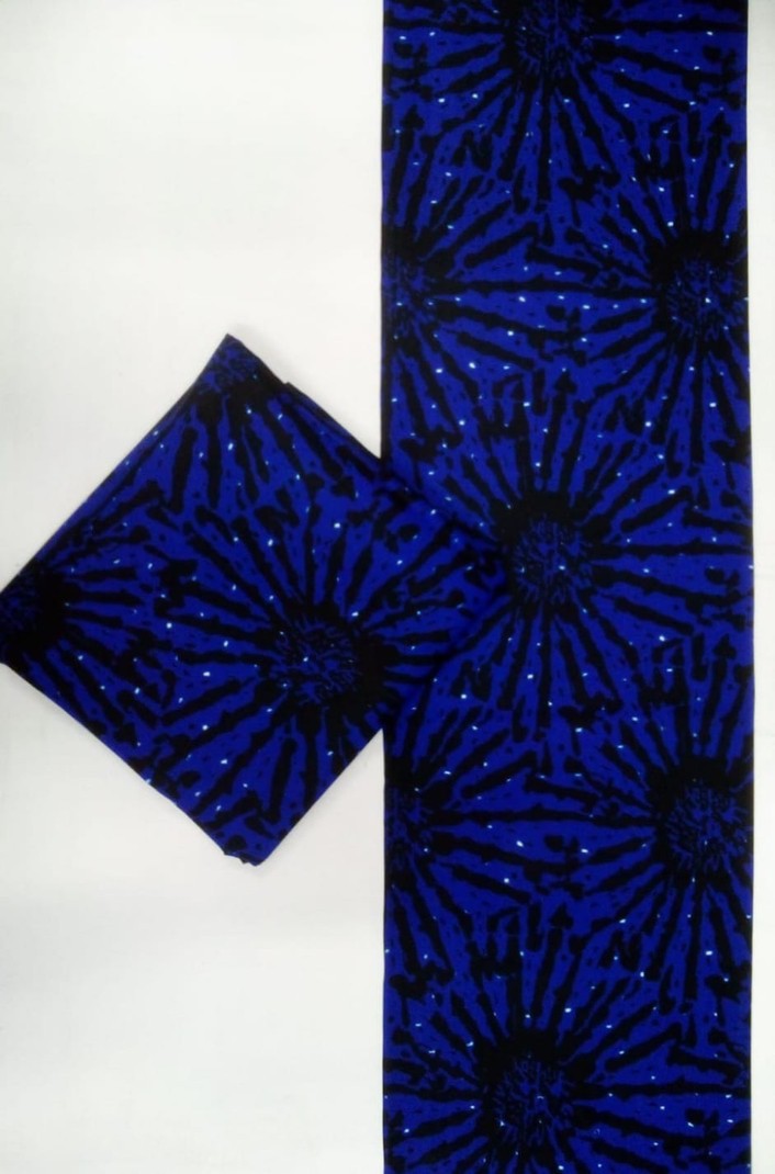 Rich royal-blue Ankara with starburst formations and subtle dotted highlights. Elegant and deep-toned, ideal for evening looks, agbadas, kaftans, and structured garments.