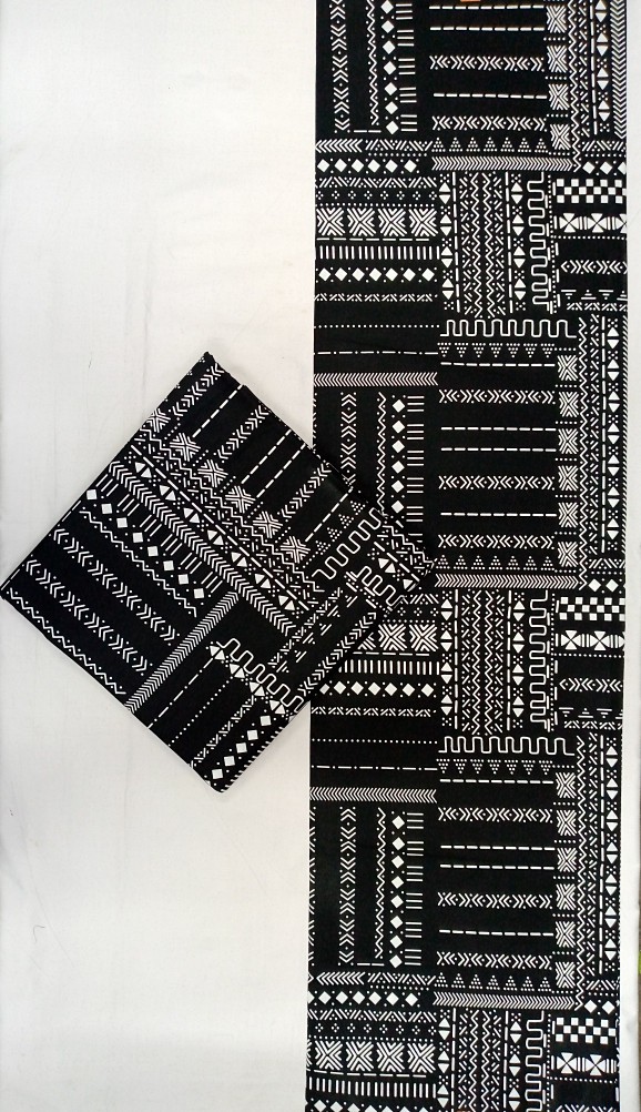 A bold black and white grid showcases detailed ethnic-inspired linework and symbols, forming a structured, monochrome pattern with striking cultural elegance.