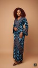 A masterful blend of structure and flow, this long-sleeve maxi dress commands attention. The fabric features an intricate geometric pattern of bright blue lines against a black background, with striking V-shaped paneling in black and baby pink that frames the neckline and bodice. The bell-shaped sleeves add a dramatic, feminine flair. A truly unique piece, ideal for formal occasions, gallery openings, or a polished evening out. Material: Ankara and handwoven aso-oke Color: Multicolor