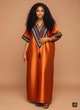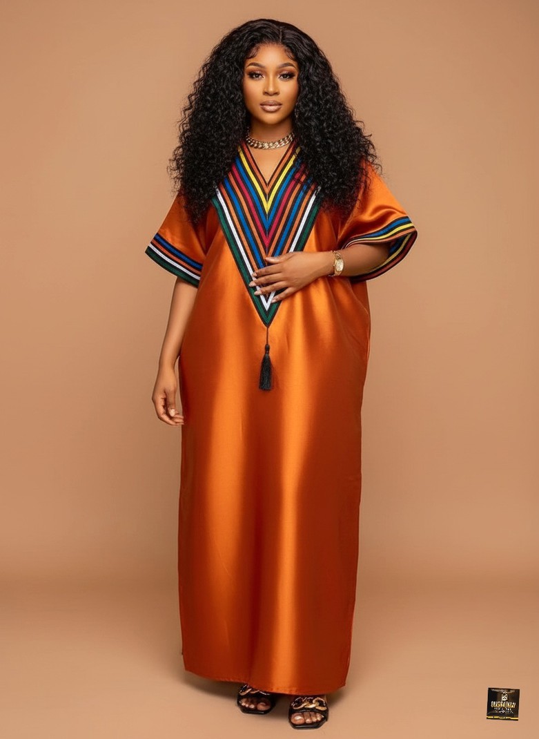 Radiate sophistication in this luxurious, floor-length kaftan. The fabric has a beautiful silk orange color giving it a rich and elegant drape. The focal point is the deep V-neckline, beautifully trimmed with vibrant, multi-colored handwoven aso-oke stripes in red, blue, green, and yellow, creating a striking chevron pattern. A chic black tassel hangs from the center V. The wide sleeves are also finished with matching striped trim. Style: V-Neck Kaftan Maxi Dress Material: Silky Saffron Orange with handwoven aso-oke Color: Multicolor Key Features: Dramatic rainbow Kente-style chevron trim on the neckline and sleeves; wide, flowing silhouette. Best For: Formal events, glamorous resort wear, cultural celebrations, or an elegant evening out.