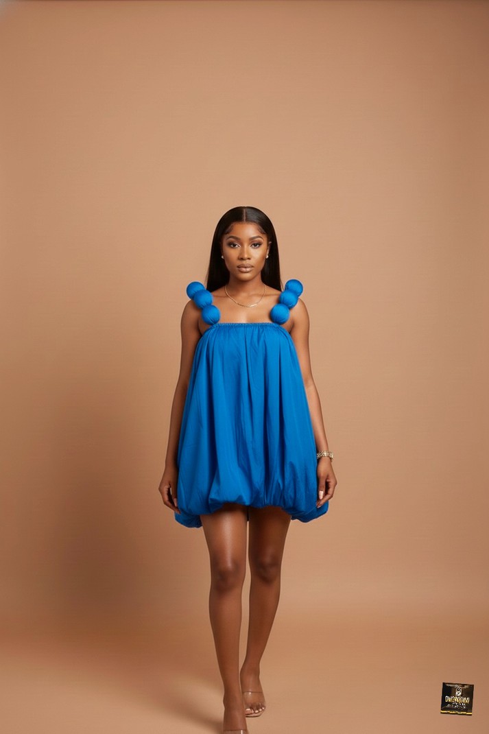 This playful and vibrant garment is a mini-length bubble dress that embodies fun and modern summer style, crafted from a lightweight, crepe fabric, which holds its shape beautifully and is rendered in a stunning, attention-grabbing shade of blur. The dress features a square neckline that leads to its most distinctive feature, the thick shoulder straps are creatively adorned with large, matching fabric-covered spheres or balls, giving the piece a unique, sculptural, and whimsical touch. The body of the dress flows from the neckline into a voluminous, gathered silhouette that tapers slightly at the short hemline, creating the classic, flouncy 'bubble' effect. This piece is a bold, effortless statement that beautifully combines a relaxed fit with high-impact design details. This chic and spirited bubble dress is perfect for casual but stylish warm-weather occasions and summer leisure. It is an ideal choice for beach vacations, outdoor parties, poolside events, summer festivals, or casual daytime outings like brunch or shopping when you want a fun, statement look. Material: crepe Color: blue
