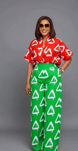 This chic two-piece ensemble features a high-low tunic paired with matching wide-leg trousers, both expertly crafted from high-quality, breathable cotton that offers a luxurious sheen and a fluid, comfortable drape. The outfit showcases a sophisticated adire-inspired pattern in shades of deep navy, soft pink, and white, with the top boasting a modern asymmetrical hemline and a simple round neckline for a contemporary touch. This set is the perfect choice for professional networking events, upscale afternoon teas, or artistic social gatherings where you want to project a sense of bold, modern elegance rooted in traditional textile art.