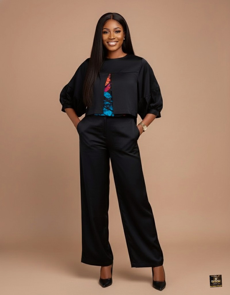 chic and versatile two-piece set, this ensemble is defined by its crisp black satin fabrication and modern silhouette, offering a contemporary take on tailored elegance. The top is a fashion-forward cropped style with voluminous, three-quarter puff sleeves, featuring a classic crew neckline. A vibrant, multi-colored abstract print panel is incorporated beneath the cropped jacket line, peeking out to add a bold pop of color and texture to the otherwise monochromatic look. Paired with coordinating high-waisted, wide-leg trousers, this set is ideal for stylish day-to-night transitions or sophisticated social gatherings. Material: crepe, ankara Color: black