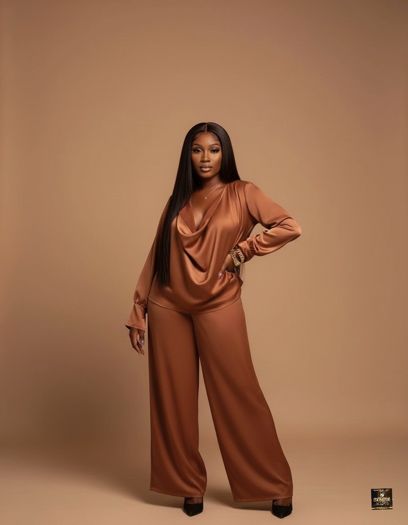 Rich in texture and color, this stunning two-piece set is presented in a deep, warm bronze satin that exudes autumnal elegance and luxury. The top features a beautifully soft and voluminous cowl neckline, creating a graceful drape across the chest, and long sleeves with fitted cuffs that balance the flow of the bodice. This is perfectly complemented by matching wide-leg trousers, maintaining a continuous, elongated line from shoulder to floor. This ensemble is designed for warmth and sophistication, making it an excellent choice for upscale evening events or refined seasonal occasions.