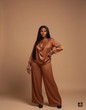 Rich in texture and color, this stunning two-piece set is presented in a deep, warm bronze satin that exudes autumnal elegance and luxury. The top features a beautifully soft and voluminous cowl neckline, creating a graceful drape across the chest, and long sleeves with fitted cuffs that balance the flow of the bodice. This is perfectly complemented by matching wide-leg trousers, maintaining a continuous, elongated line from shoulder to floor. This ensemble is designed for warmth and sophistication, making it an excellent choice for upscale evening events or refined seasonal occasions. Material: Satin Color: brown