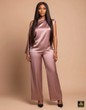 A study in subtle femininity and modern tailoring, this two-piece pants set features a gorgeous dusty rose (mauve/pink) satin fabric with a flattering matte sheen. The top showcases a refined, asymmetric neckline that falls off one shoulder, with a beautifully draped bodice that gently cascades over the hips, providing coverage and a flowing aesthetic. It is sleeveless on one side and features a slightly longer, elbow-length sleeve on the other. This elegant top is paired with sleek, matching wide-leg trousers, creating a monochromatic ensemble that is polished, sophisticated, and perfect for dinner parties or evening social events.
