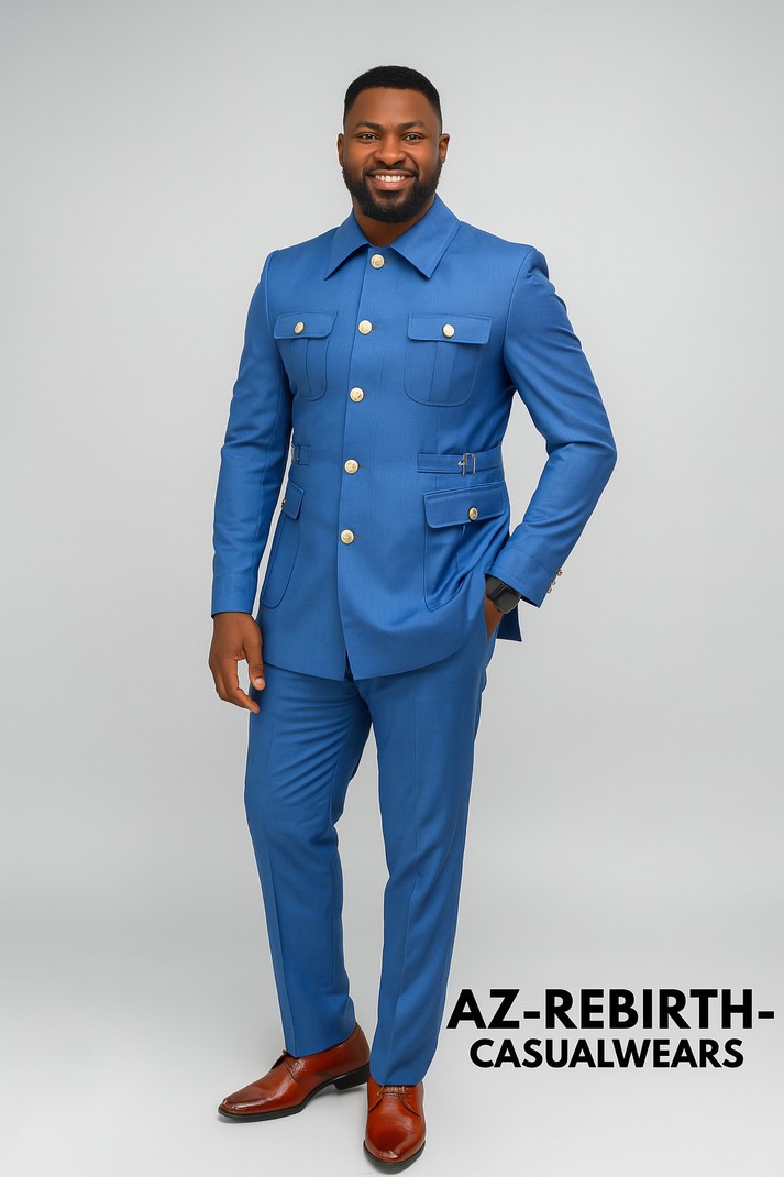 This modern two-piece safari suit is designed for the man who values class and confidence. It features a clean tailored cut, flap chest and side pockets, and smart waist adjusters that offer a perfect fit. Whether for weddings, outings, or formal occasions, this outfit makes a bold fashion statement without saying a word. Available in all sizes.