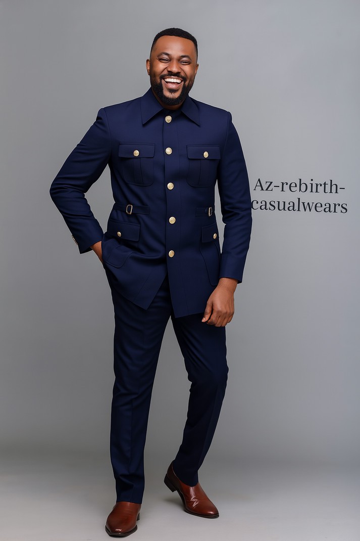 This modern two-piece safari suit is designed for the man who values class and confidence. It features a clean tailored cut, flap chest and side pockets, and smart waist adjusters that offer a perfect fit. Whether for weddings, outings, or formal occasions, this outfit makes a bold fashion statement without saying a word. Available in all sizes.