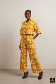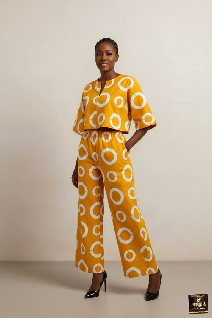 Sleek, modern, and effortlessly stylish , this two-piece ankara set combines tradition with contemporary design. The outfit features a loose-fit crop top with a slit neckline and wide sleeves, paired with matching high-waisted palazzo trousers. The striking white circular motifs on deep yellow fabric create a bold, geometric aesthetic. Perfect for work events, social gatherings, or casual chic days.