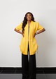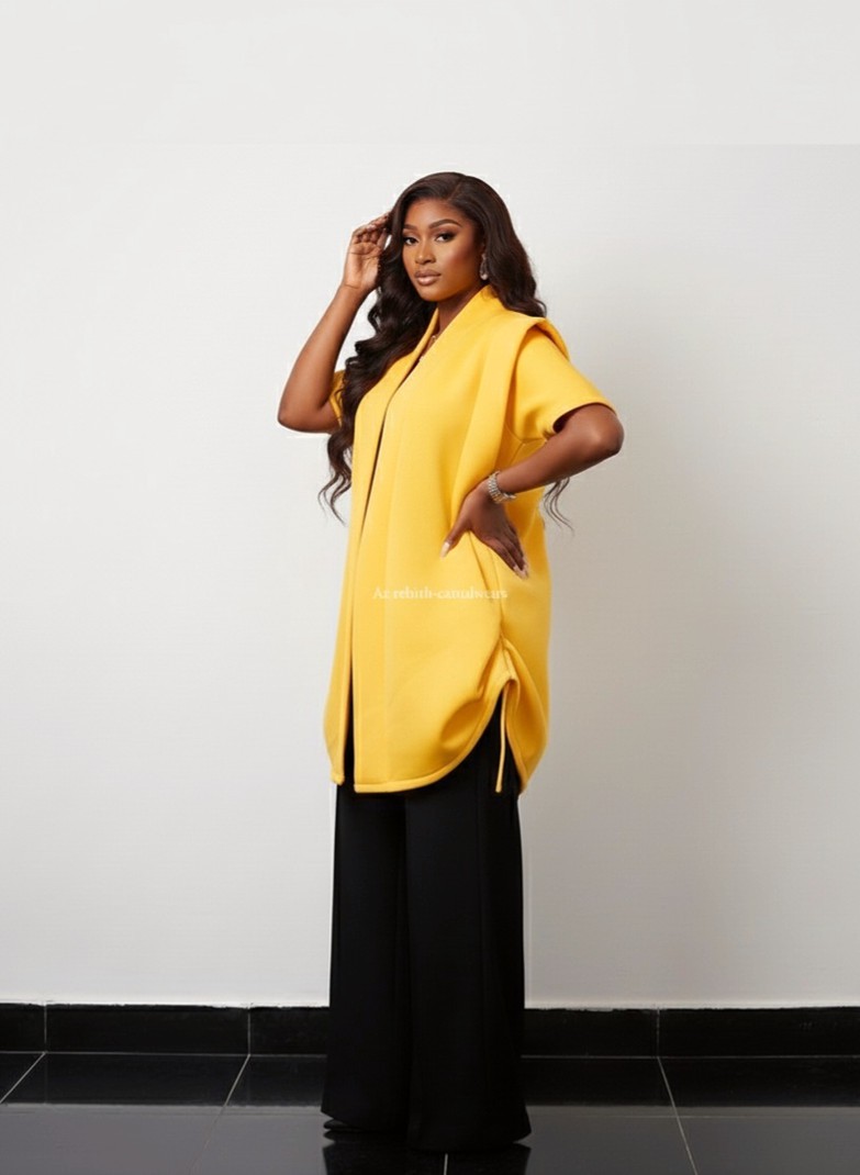 Stylish Yellow Jacket & Black Pant Set Make a statement with this eye-catching two-piece outfit. The set includes a vibrant yellow jacket with a unique, draped front and stylish pleated shoulders. It comes with classic black wide-leg pants that are comfortable and flattering. This outfit is perfect for work or a special event. Pair it with heels for a polished and confident look.