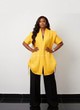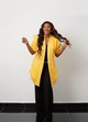 Make a statement with this eye-catching two-piece outfit. The set includes a vibrant yellow jacket with a unique, draped front and stylish pleated shoulders. It comes with classic black wide-leg pants that are comfortable and flattering.
