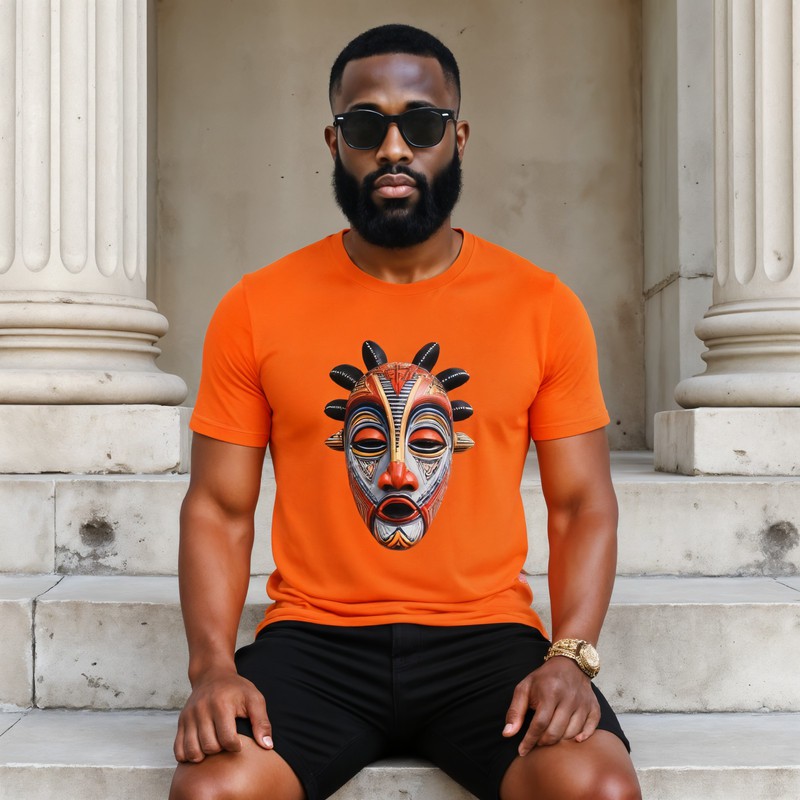 This luxurious organic cotton T-shirt is a bold and stylish way to make a statement. The vibrant multicolored mask print is inspired by the rich cultures of the world, and it will turn heads wherever you go.