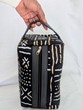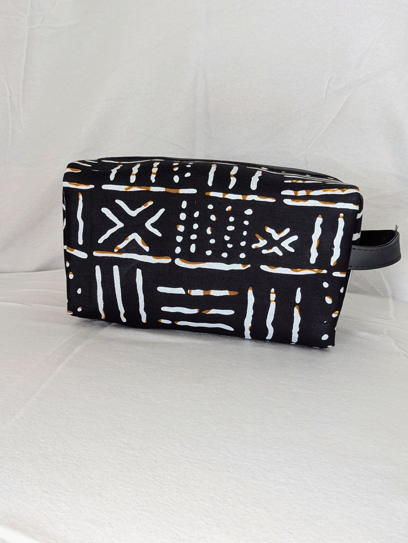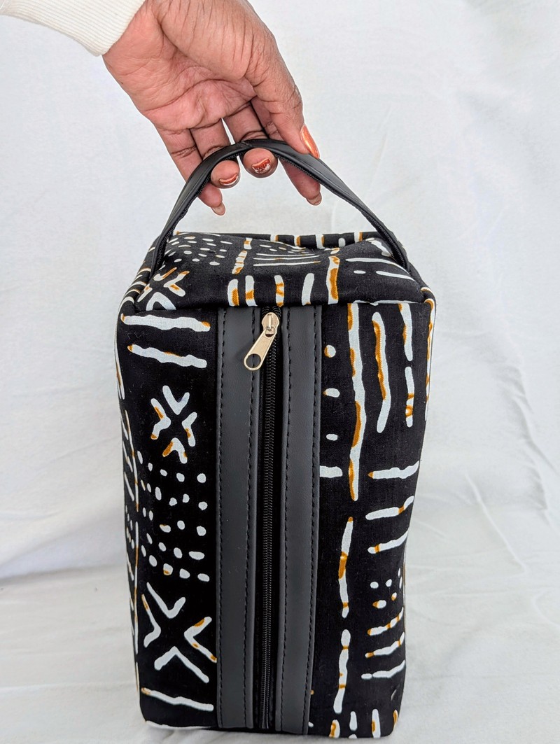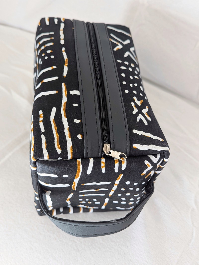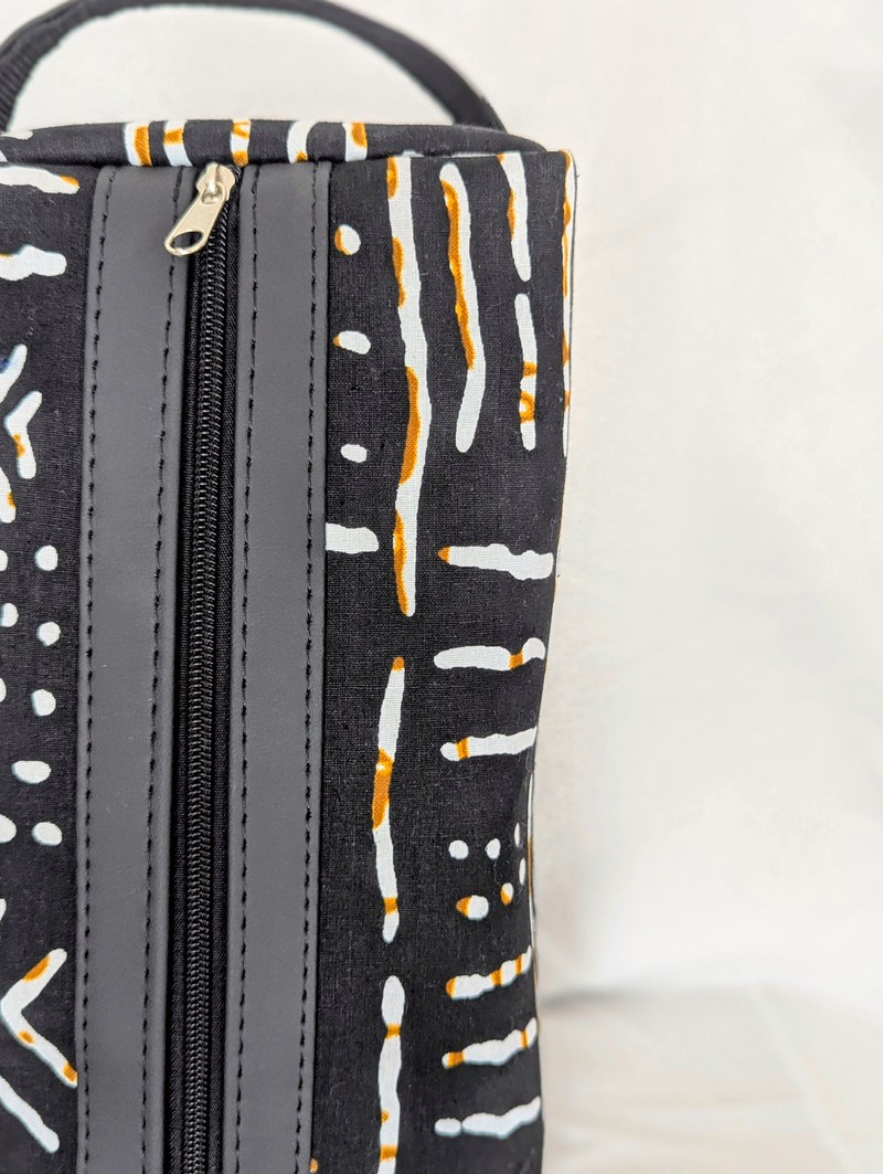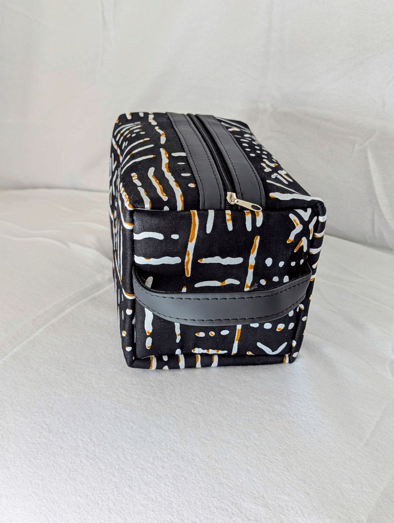 Ce vanity est conçu en tissu wax et en similicuir pour le renforcer.