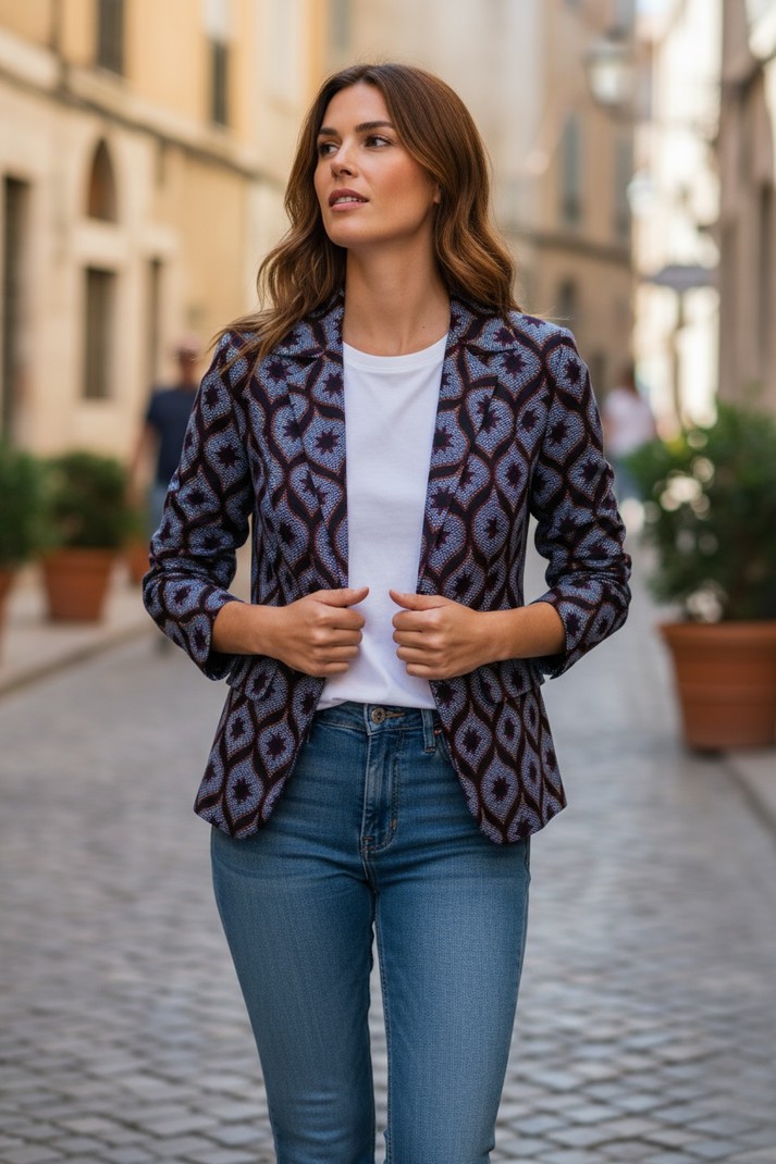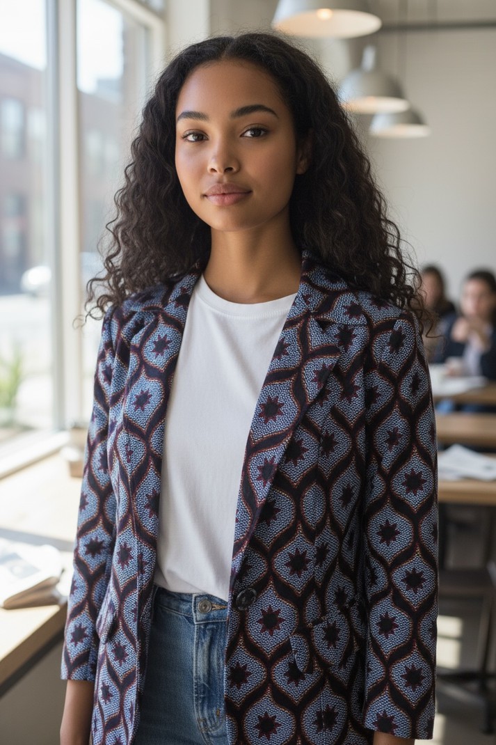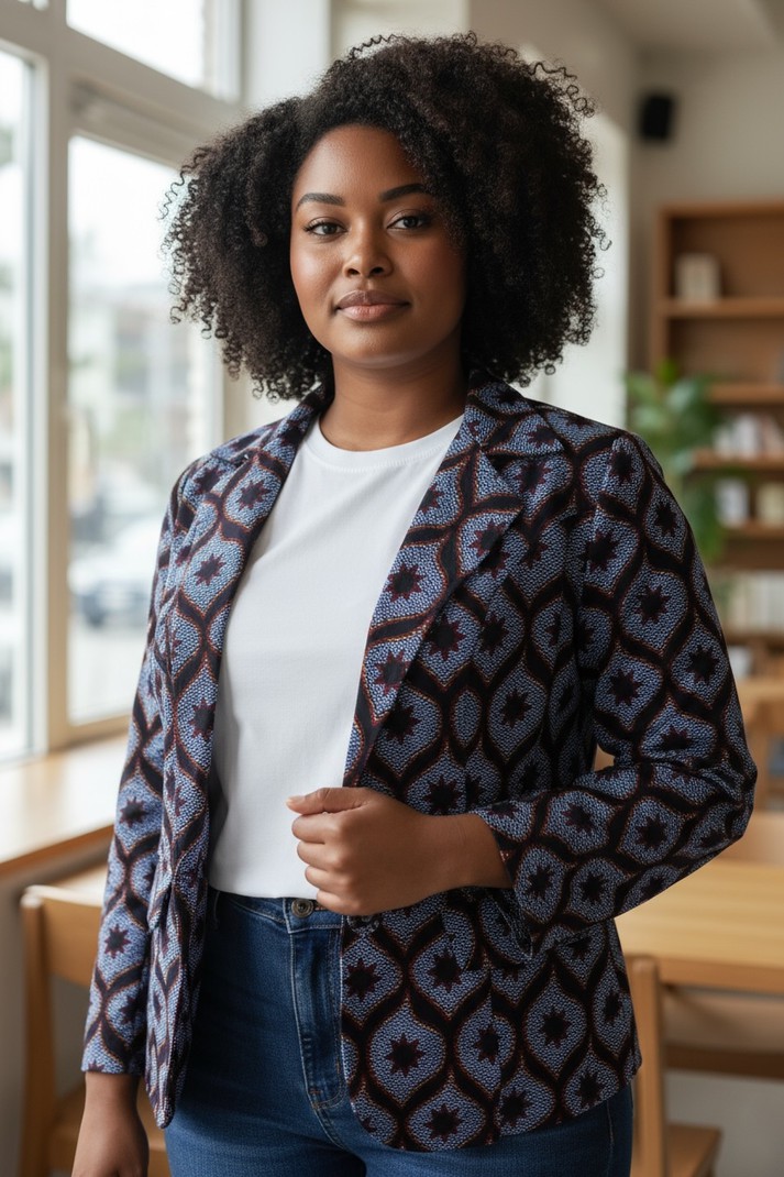Apportez une touche de caractère à votre allure avec la veste en wax “Élégance Graphique” signée Maison AFOUA. Conçue pour la femme moderne, cette pièce unique incarne parfaitement le mariage entre raffinement européen et audace africaine.