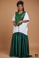 A flowing, beautiful white and green maxi kaftan that exudes grace and comfort. The loose, oversized fit is both flattering and chic, featuring a V-neckline and short kimono sleeves. A shimmering metallic green panel at the chest and a dramatic gathered green satin ruffle at the hemline give this dress a luxe, festive feel. Ideal for celebratory events, holiday gatherings, or comfortable yet elegant wear.